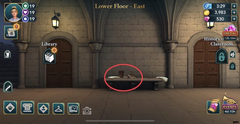 下層階 - 東 :図書館の隣のベンチにある散らかった本をクリックします。それらは再び積み重なって、あなたに 1 エネルギー ポイントを与えます。