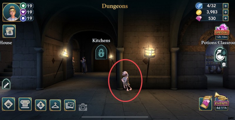 ダンジョン :屋敷しもべ妖精は、キッチンの隣のダンジョンに隠れています。それはあなたに 1 エネルギー ポイントを与えます。