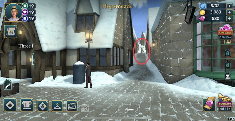 ホグズミード :Three Broomsticks Inn と Honeydukes の間の路地の端で手を振っている小さなキャラクターをクリックします。