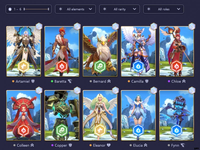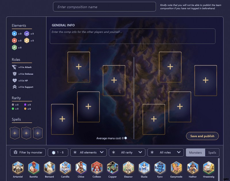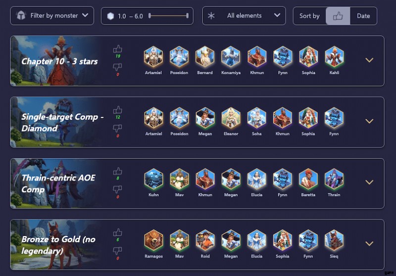 「モンスター」タブには、各モンスターの専用ページがあり、マナ コスト、エレメント、レアリティ、役割のフィルターが表示されます。モンスター ページには、モンスターについて知っておくべき情報がすべてまとめられています .その特徴、スキルとパッシブ、基本ステータスと 3 つのスキル ストーン。 ルーン セットもご覧いただけます コミュニティによって提案された構成 このモンスターに。
