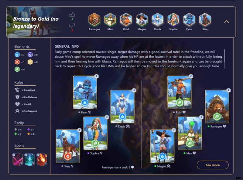 モンスターの追加は全てドラッグ&ドロップで行います。モンスターや呪文を簡単に追加するためのフィルターがたくさんあります。 コンポジション作成ツール マナの平均コスト、コンポジションに存在するモンスターの要素と役割、およびそれらの希少性を視覚化できます。また、モンスターを直接クリックすると詳細ページが開きます。