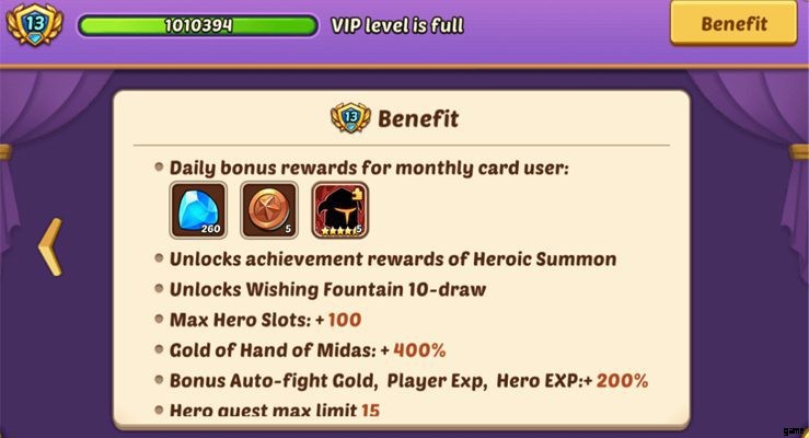 Idle Heroes プライベート サーバーでプレイする 、ゲームの公式はしごを登ることができなくなります。しかし、自分のコーナーでプレーし、がんばるためにそこにいない人のために 、それは興味深い、特に経済的な解決策です。このバージョンのゲームではすべてが高速化されています。プレーヤーは VIP 13 から始まります さまざまなボーナスを受け取ります。これらには以下が含まれます: