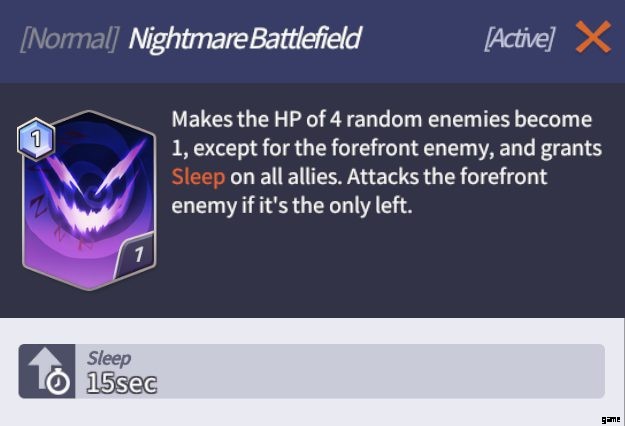 第12章の特集は悪夢の戦場 スペル。確かに、この呪文は自分のモンスター4体をランダムにライフを1点に落とします。また、相手モンスターを15秒間眠らせる。