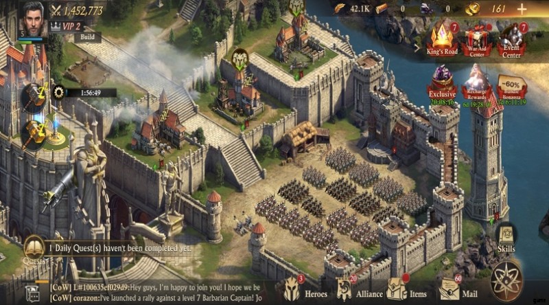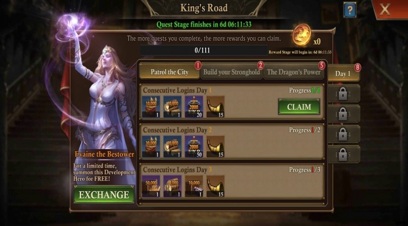 このタイプのすべてのゲームと同様に、集める必要があります リソースを生成します 建物を建設し、軍隊を配備し、兵士を訓練します。これらのリソースがインベントリに届くまでに時間がかかるため、このゲームは我慢のゲームです .あなたの目標は、構築したものを改善して自分の王国を管理することです。これを行うには、多くのリソースだけでなく、ボーナスと呼ばれるブースターも必要です。 、建設加速オブジェクト、または金貨でさえもより速く進みます!幸いなことに、このゲームには 報酬 があります デイリー、リワード メイン、サイド、デイリー クエスト、および リワード ログインする!