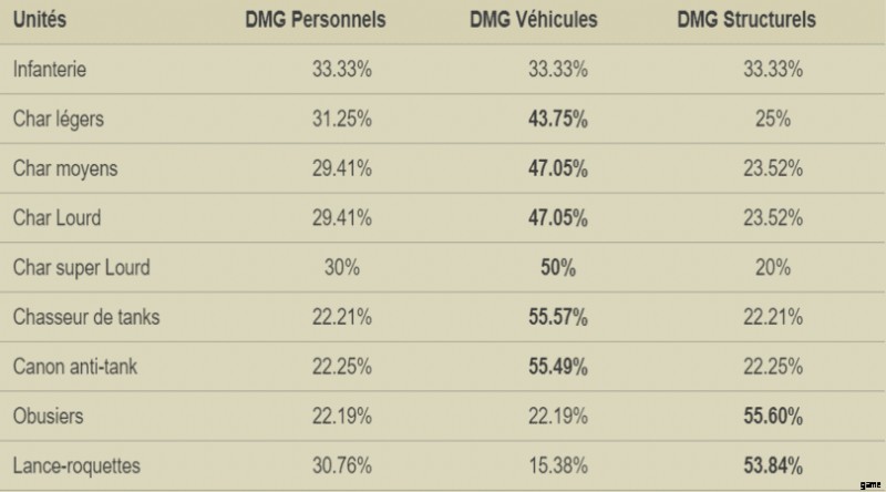 多くの場合、フィールドでは、同じターゲットに対して 2 つのユニットが必要です。ターゲットのタイプ (軽戦車、歩兵など) に応じてブレークを変更します。これは、選択したユニットに応じた推定ダメージの小さな表です。 およびターゲット: