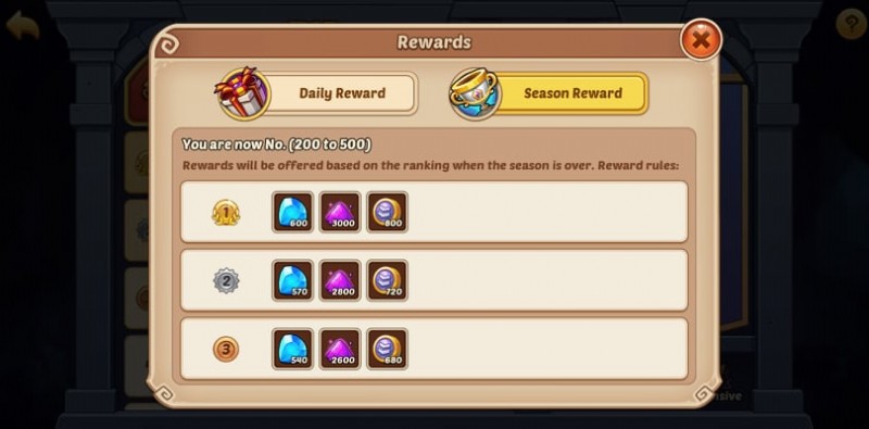 - 季節限定の報酬 (Crystal Crown League):このリーグは常時オープンしています。季節は互いに続き、各季節は 14 日間続きます。ランキングに応じて、最大 600 個の宝石、3,000 個の魔法の粉、800 個の栄光のコインを獲得できます。