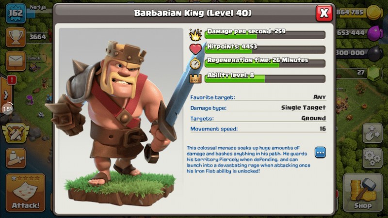ブラックエリクサーを消費したおかげで、バーバリアンの王はクラッシュ・オブ・クランで最大かつ最も強力なバーバリアンになりました。彼のサイズ 、HP とDPS 防御と攻撃の両方で、彼を敵にとって手ごわい敵にします。