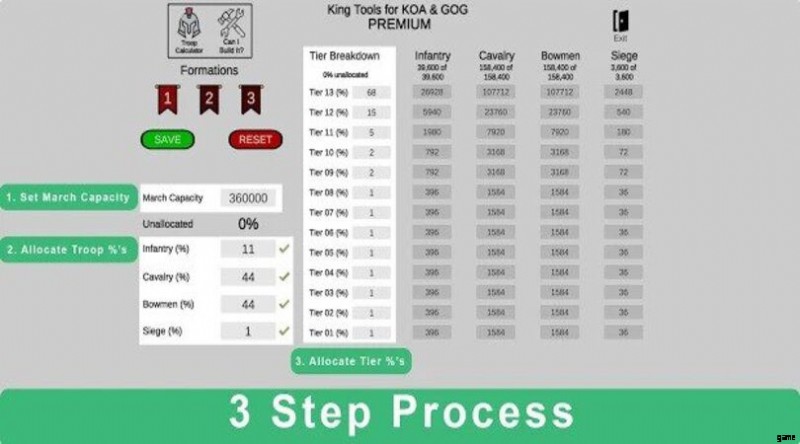 部隊編成計算機を使用する理由 キング・オブ・アバロンはシンプルです。このゲームをプレイするときは、攻撃のために行進する独自の軍隊を構成する必要があります!たとえば、騎手の数、射手の割合などを選択する必要があります。KoA 部隊では 電卓ツール、これは自動的に行われます。心配する必要はありません。まとめると、部隊編成計算機 時間の節約です そしてあなたの戦いに勝つための保証。 ⚔️