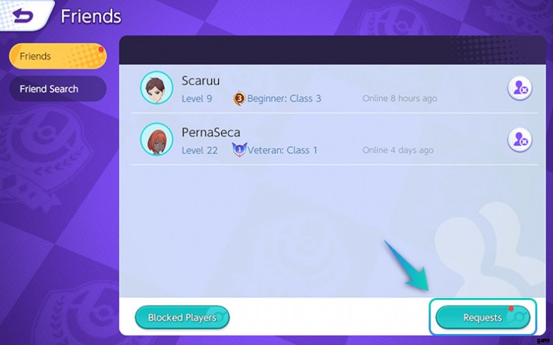 友達を追加を押します ボタン。あなたはすでに道半ばです。他のプレイヤーはあなたのリクエストを受け入れる必要があります。大したことではありません。友達リスト ([友達] メニューの別のタブ) に移動し、[リクエスト] ボタンをクリックする必要があります。あなたの友達リクエストが表示されます あなたの Pokémon Unite トレーナー名と一緒に。