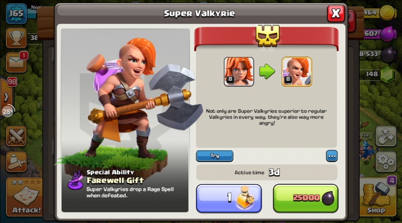 彼女はまた、さらにやりがいのあるヒット ポイントと DPS 統計を持っています。スーパー ヴァルキリーは背中に怒りの呪文を持っています 特殊能力を起動したときに彼女が使用する さようならギフト .他のブーストされた部隊とは異なり、スーパー ヴァルキリーは戦闘で敗北すると特殊能力を解き放ちます。