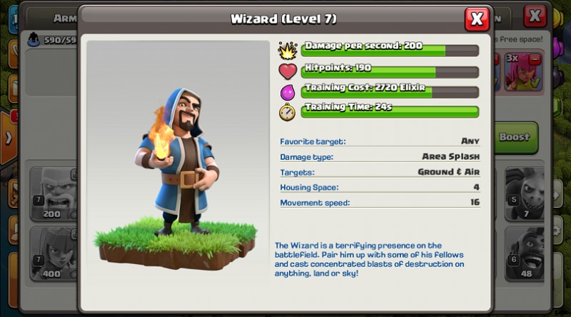 トレーニングできます クラッシュ オブ クラン ウィザード 兵舎にピンクのエリクサーを持っています。彼は優れた DPS 統計を持っており、陸上で移動しますが、空と地上の部隊を攻撃できます 同様にうまくいきます。ただし、彼のヒット ポイントは非常に少ないため、ヒット数はほとんどありません。