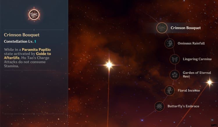 Hu Tao は星座がなくてもプレイできますが、マウントするとパワーとプレイアビリティが向上します。彼女の C1 スカーレット ブーケのおかげで 、パラミタ・パピリオにいるとき、彼女のチャージ攻撃はもうスタミナを消費しません モード。しかしそれだけではありません。彼女の C6 バタフライズ フライト HP が 25% 未満の場合、攻撃力と抵抗力が大幅に増加します。