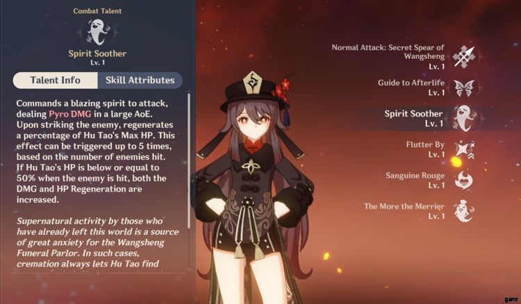 フー タオのエレメンタルの大暴れ スピリット スーザー 火の精霊を召喚し、広範囲にパイロの大ダメージを与える。同時に、最大HPに比例してフー・タオを回復します。彼のヘルス ポイントが 50% を下回るまで待つことをお勧めします。