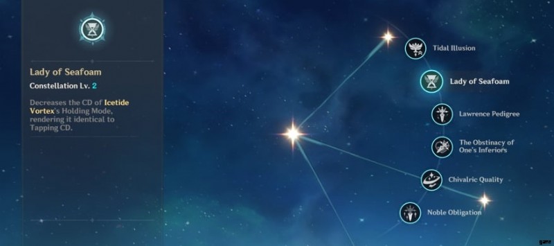 すでに持っている場合は、もう一度入手して星座を増やすことができます。 C1 タイダル イリュージョン 彼女に物理ダメージ ボーナスと C2 Lady of Seafoam を与えます 属性攻撃の長押しのクールダウンを短縮します。