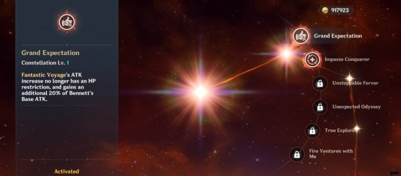 また、ベネットがすでにいる場合は、星座を増やします 彼をさらに強くすることができます。彼を C6 にマウントすることは必須ではありません。一緒にプレーしているチームによっては、お勧めしません。一方、C1しかお勧めできません。キャラクターの主な関心は、その究極の能力にあります:素晴らしい旅 、あなたのヒーローを癒すことに加えて、彼らの攻撃を強化します. C1 ジャーニー パースペクティブ 攻撃ボーナスの HP 制限を解除し (基本的には、体力が 70% を超えるキャラクターで機能します)、ベネットの ATK を増加させます。