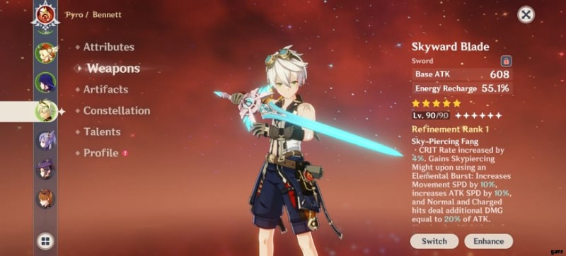 残念ながら、セットがすべてではありません!成功するためには、Genshin Impact でのベネットの武器の選択が重要です。 スカイウォード ブレード 最適な機器オプションです。ただ、星5の片手武器なので入手はかなり難しいです。
