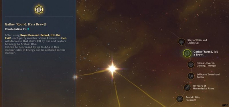 プリモジェムがたくさんある場合 アラタキ イットウをメインの DPS にする予定です。彼を複数回使用すると、彼の星座により、キャラクターがさらに強力になります。 . C2ジェネラルランブル! 彼のエレメンタル ランページのクールダウンを 4.5 秒に短縮し、チーム内のジオ ヒーローごとに 6 エネルギー ポイントを回復します。