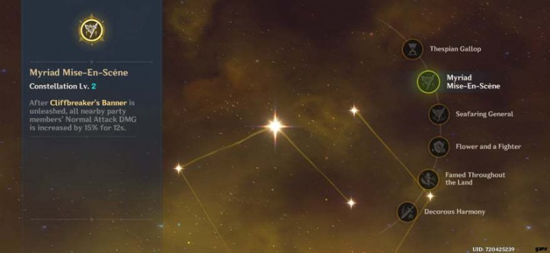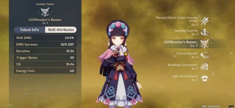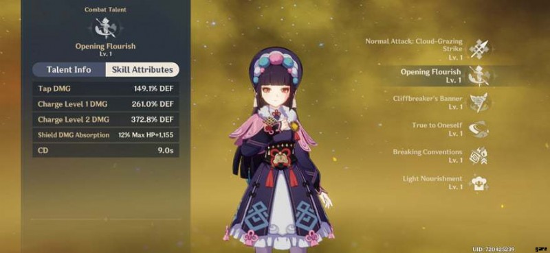 ユンジンはサポートキャラ。彼のエレメンタルの大暴れ 断崖破りの旗 裸の旗を与える チームのすべてのキャラクターに。ユン・ジンの防御力に応じて通常攻撃が強化される(能力レベル1で32%、レベル10で約58%)。各キャラクターは 30 チャージを取得します。複数の敵を攻撃すると、同じ数のチャージが消費されます。