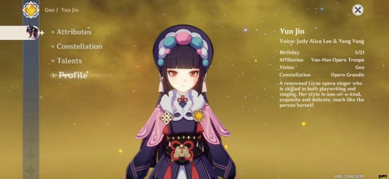 Yun Jin は、Liyue Port Opera ステージを拠点とする Yun-Han 劇団のディレクターです。 .彼女はフォロワーの歴史を語るのが好きです。彼女のパフォーマンスは詩的かつダイナミックであり、すべて彼女の衣装によって強化されています.