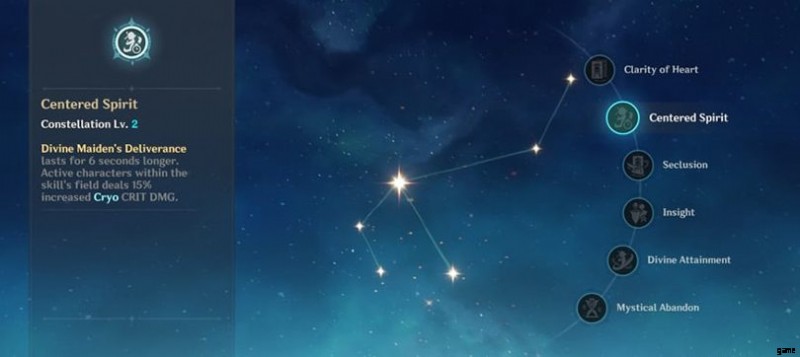 神河は星座がなくてもプレイできますが、キャラクターを大幅に強化できます!彼の精神中心 C2 はエレメンタルの暴走を 6 秒間延長し、攻撃によって生成されたフィールド内のキャラクターのクリティカル ダメージとクライオ ダメージを 15% 増加させます。