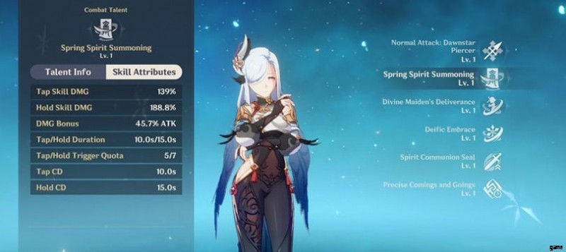 Shenhe のゲームプレイは主にサポート指向です。 Spring Spirit Summoning で彼女は Cryo ダメージを与え、ゲーム内のヒーローの Cryo 攻撃を強化します エレメンタルアタック。氷のダメージを与えることに加えて、すべてのキャラクターがIcy Quillの恩恵を受けます