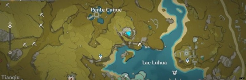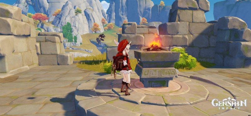 それらを読んだ後、ルハ湖の東にある崖の遺跡に直接行きます .それまでは、複雑なことは何もありません。マップに示されている位置に従い、東側の Qiongji 河口にテレポートします。次に、木の柱を見つけます。 パイロのキャラクターで火をつける .たとえば、ベネットでこれを行うことができます。