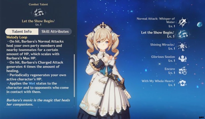 原神インパクトでバーバラを上手にプレイするには、これら2つの能力をできるだけ高めることをお勧めします.バーバラは、能力以外でキャラクターを癒すことが不可能なスパイラルの深さで特に役立ちます.