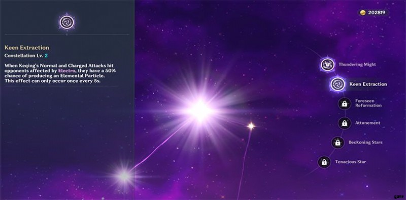 彼の C2 厳しい課税 通常攻撃またはチャージ攻撃が電気属性の影響を受けた敵に命中すると、50% の確率でエネルギー粒子を生成します。そして彼の C4 チューニング 電気関連の元素反応をトリガーした後、Keqing の攻撃力を 10 秒間 25% 増加させます。