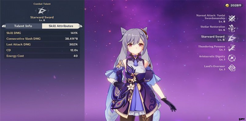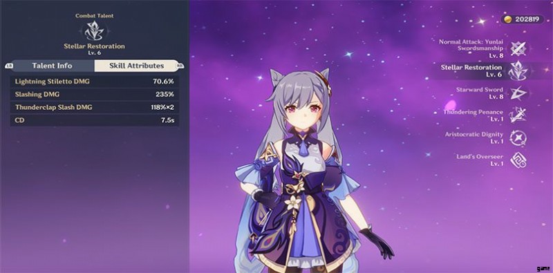 その後、別のキャラクターまたは Keqing のエレメンタル ランページ「Celestial Walk」でフォローアップします。 '。 Keqing は、一連の素早い、電気を含んだ剣の一撃を放ちます。最後の一撃は広範囲に大ダメージを与える。彼のアリオスの宝物で 受動的で、Keqing の CRIT 率が増加し、エネルギーの再充電も増加します。