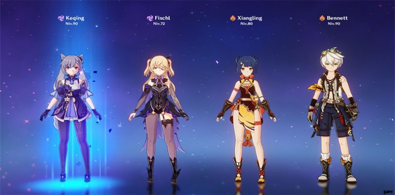 - Fischl / Xiangling / Bennett / Keqing:この 2 つのエレクトロと 2 つのパイロのチームで、素反応を連鎖させます。