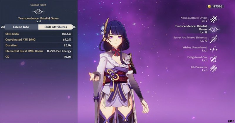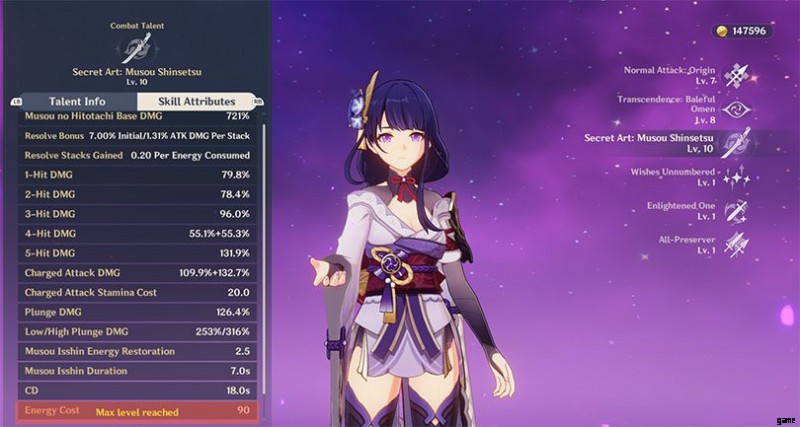 したがって、雷電は、多くのダメージを与えることに加えて、キャラクターに多くのエネルギーを生成します.雷電のエレメンタル ダメージ レベルを最大まで上げてから、彼女のエレメンタル タレントを 2 番目に上げることをお勧めします。