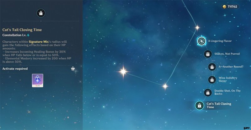 C6の最終ラウンド エレメンタルの暴走を促進:特殊バットのアルコール蒸気フィールド内のキャラクター HPが50%以下の場合、30%の回復ボーナスを得る。このしきい値を超えている場合、エレメンタル マスタリーが 200 ポイント増加します。