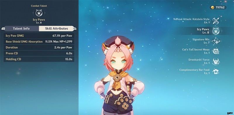 ディオナは主に原神インパクトのサポートとしてプレイされ、チームメンバーを保護して癒す.彼女のエレメンタルアタック「Cryo Claws」 " は、Cryo ダメージを生成する爪を放ちます。爪が敵に命中すると、命中したターゲットの数に応じて一定時間持続するシールドを生成します。このシールドは、ディオナの最大 HP に比例した量のダメージを吸収します。さらに保護するために、長押しを好む; Diona は退却し、5 つの Cryo Claws を引きます. シールドは 75% のダメージ吸収ボーナスを獲得し、DMG Cryo に対して 250% の効果があります.