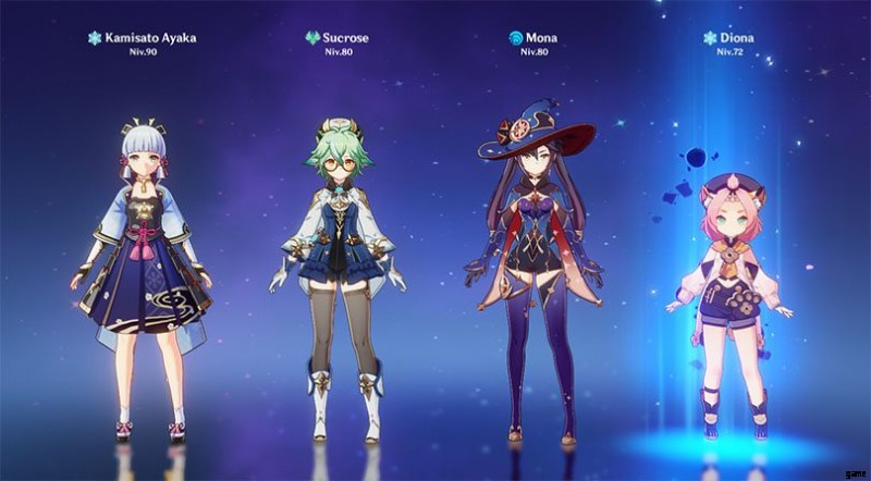 - 永久凍結チームで Diona を演じる。彼女を別のクライオ ヒーローとチームを組むことで、敵が凍っている、またはクライオ要素の影響を受けているときに、グループのクリティカル率が 15% 増加します。 絢香のチームをお勧めします 、 一葉 または ベンティ またはスクロース 、星丘 またはモナ とディオナ .