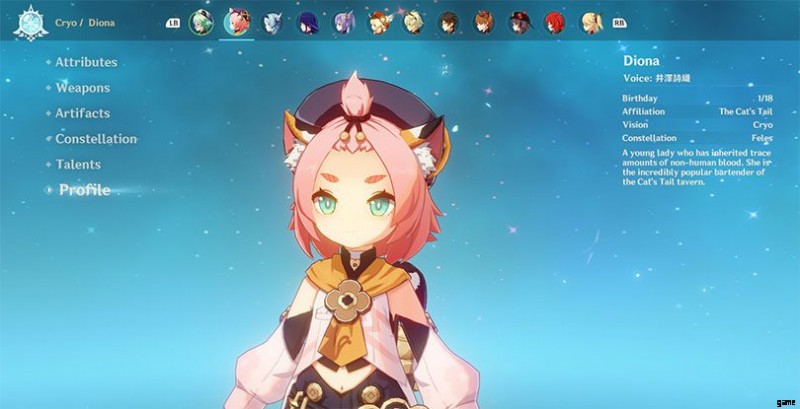 ディオナは1月18日に生まれました。彼女は約 12 歳ですが、この猫のような外見の少女は、モンドシュタットのキャッツ テールでバーテンダーとして働いています。これは、彼女がアルコールを嫌い、疑わしいが奇妙においしいカクテルを作ることを止めるものではありません.約 1.34 m の Diona は、Genshin Impact で最小のキャラクターの 1 つです。
