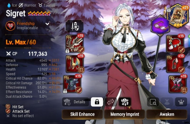 - 4ピース 装備セット :あなたの進行状況に応じて。エピック セブンでの最初の数日間に与えられる攻撃セットを利用して、シグレットを攻撃的にすることができます。その後、スピード セットに切り替えるか、より優れたアタック セットを取得することができます。本当にダメージを最大化したい場合は、レイジ セットが他のセットよりも優れていますが、入手はより困難です。