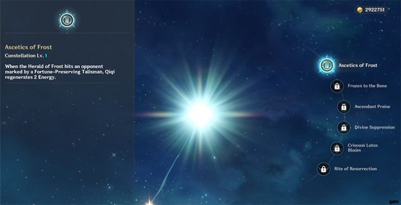 Qiqi の主な欠点の 1 つは、発電量が非常に少ないことです。この欠陥は、彼の最初の星座で部分的に修正されています。 " フロストの修行者 " は Herald of Frost するたびにエレメンタル エネルギー ポイントを 2 ポイント与えます。 タリスマンでマークされた敵に命中します。