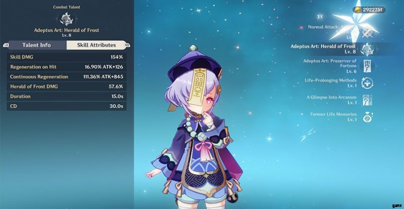 彼の基本的な才能:" Adeptus Art:Herald of Frost "ヘラルド オブ フロストを具現化 近くの敵にクライオダメージを与える。フィールド上に15秒間留まる。 Qiqi の通常攻撃とチャージ攻撃 敵に当たったときにキャラクターの健康を回復します。回復量はチーチーのATKに比例する。そして、キャラクターを切り替えても、Herald of Frost はアクティブなヒーローを回復し続けます。