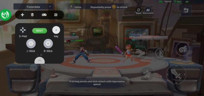 その後、Mantis Gamepad から Flash Party を起動します。すぐに、ゲームの上に緑色の Mantis アイコンが表示されます。エミュレータと同様に、訓練場に行ってキーを調整することをお勧めします。そこで、Mantis アイコンをクリックしてインターフェイスを表示し、小さな「+」をクリックします。 」にアクセスして、コントローラー アイテムの選択にアクセスします。BlueStacks と同様に、アイテムをピックアップして目的の場所にドロップします。 アクションにキーを割り当てます。