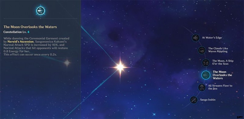 最後に、C4「The Moon Overlooks the Waters」 "は、ココミのエレメンタル暴走中の通常攻撃の速度を 10% 増加させます。敵を攻撃すると、0.8 ポイントのエレメンタル エネルギーが回復します。