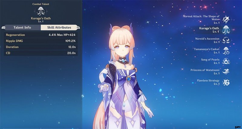 ココミのエレメンタル スキル「クラゲの誓い」を唱えることで "、あなたはバケクラゲを召喚します 12 秒間戦闘に留まります。 2 秒ごとに水力ダメージを与え、ココミの最大 HP に基づいて近くに配置されたキャラクターを回復します。
