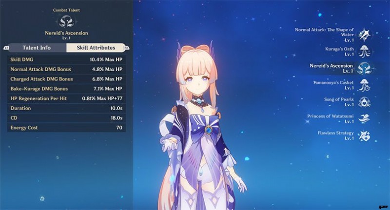 その後、ココミはエレメンタルの大暴れ「ネレイドの昇天」でより多くのダメージを与えます "。その後、彼女は儀式用の衣服を着ます .この状態は最大HPに応じて通常攻撃と溜め攻撃のダメージとメデューサのダメージが増加する。敵に触れることで、味方を回復します。才能のおかげで「玉之屋の棺」 "、アクティブな場合、ファントム メデューサの持続時間はリセットされます。