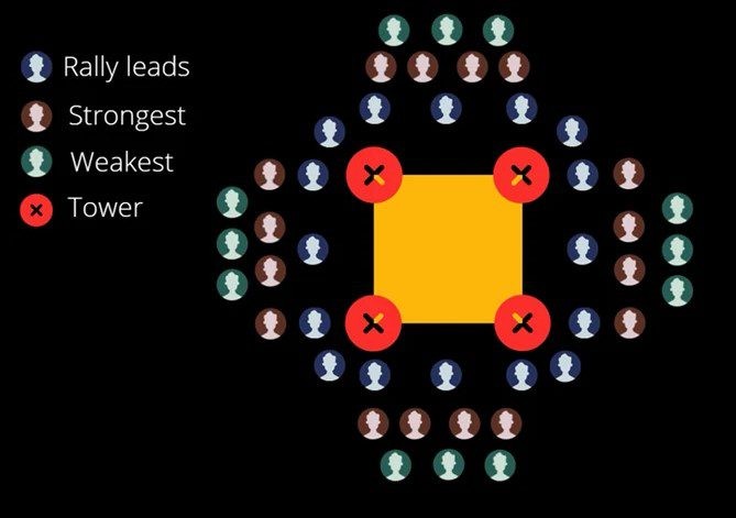 4 利用可能なタワー 北、南、西、東の基点にあります。 キャピタル クラッシュ モード は同盟でプレイされ、これらの各タワーは一度に 1 つの同盟によってのみ制御できます。軍隊によって制御されると、タワーは首都でミサイルを発射し始めます 別の同盟がそれを支配している場合。味方の火はありません。占領開始時、ミサイルは 4 分ごとに発射されます。次に、各ショット間の遅延は、1 分に達するまで 1 分ずつ短縮されます。ショットは部隊に2%のダメージを与えます 現在首都に駐在しています。