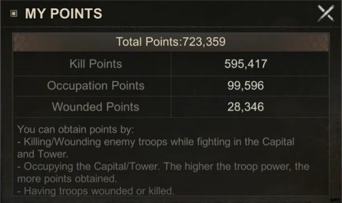 ポイントがキル、負傷、占領ポイントに分かれていることがわかります .したがって、Kill Capital Clash ポイントを獲得するには、Capital またはタワーの支配のために戦って軍隊を弱体化させる必要があります。 塔または首都の位置を保持していると、職業首都の衝突ポイントが蓄積されます 部隊が負傷または死傷者を出すと、負傷ポイントが獲得されます。