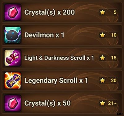 21 個から 30 個までのスターで、獲得したスターごとに 50 個のクリスタルを受け取ります。正直なところ、報酬は有益です 最大 20 スター 、それ以上に、ルーン文字を頻繁に変更し、すべてのフロアで 3 つ星を渡すためにチームを変更する必要があるため、マナと時間の無駄になります。