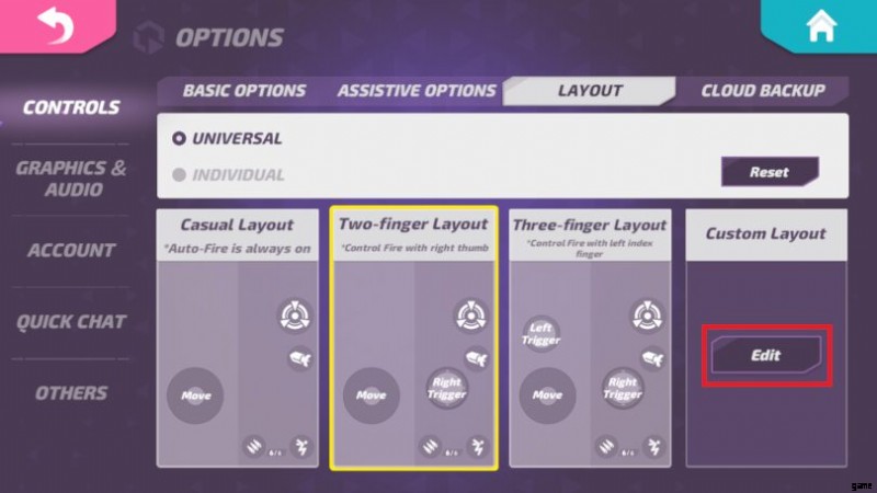 「コントロール」に留まる ] カテゴリを選択し、[レイアウト] を押します 」タブで、[2 本指レイアウト] を選択します。 」をクリックし、「編集」をクリックします " ボタン。