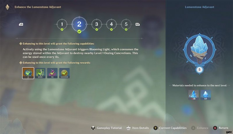 すべての機能を使用するには、レベルを上げる必要があります (10 まで)。その過程で、いくつかの報酬を収集します。 ルーメン クリスタルをできるだけ多く集めるのがコツです できるだけ。ミニマップにそれらが表示されます。また、Teyvat のインタラクティブ マップを使用して、より簡単にそれらを見つけることもできます。