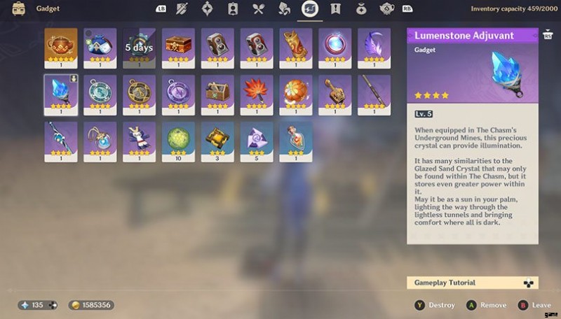最初のタスクは、ルーメン クリスタルを調べることです エリア内。次に、ルーメンストーン アジュバントの使用方法について説明します 動作します。これは、残りのクエストのロックを解除し、アビスの探索を続けるために不可欠です.地下鉱山を照らしたり、特定のエリアを覆っている黒い泥を破壊したり、アイテムやチェストをリロードしたりできます。入手したら、インベントリから装備するだけです。