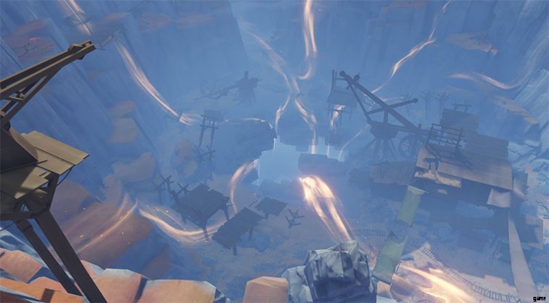 キーにドロップする必要があるフローティング構造に直面しています。 ジオグラナムのロックを解除するには、近くの岩の 1 つを壊すことから始めます .これは、かご型ジオの充電に使用されます .次に、キーの前に身を置き、ケージ型のジオを叩いて、キーの方向にクリスタルの発射体を発射します.次に、他の 2 つの合体についても同じことを行います。このステップを完了するための決まった順序はありません。