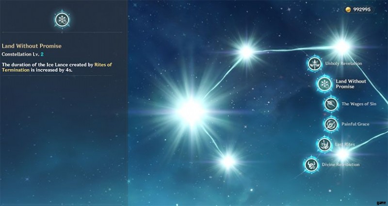 彼女の他の星座は彼女を非常に良いサポートにします.彼女の約束のない土地 C2 はエレメンタルの暴走の持続時間を 4 秒延長し、Cryo エレメントをより長く適用できるようにします。